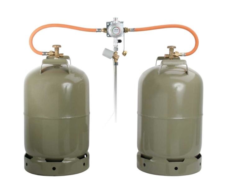 Een DuoControl Gasdrukregelaar in de caravan is een voorziening waarop je 2 gasflessen tegelijkertijd kunt aansluiten. Op het moment dat de ene gasfles leeg is, schakelt de DuoControl automatisch over naar de volle gasfles.