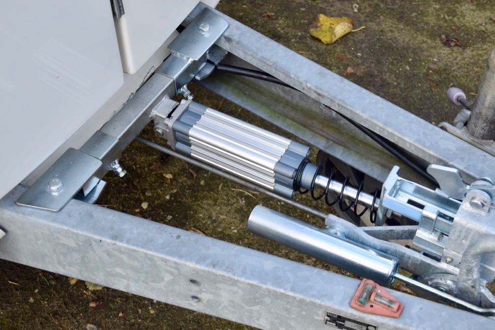 Doordat de oplooprem nu gestrekt blijft remt de caravan niet mee bij een afdaling. Tenzij er op de rem wordt getrapt, dan geeft het systeem de oplooprem weer de vrije ruimte. Laat je de rem weer los, dan wordt het schuifstuk met behulp van een cilinder weer gestrekt.